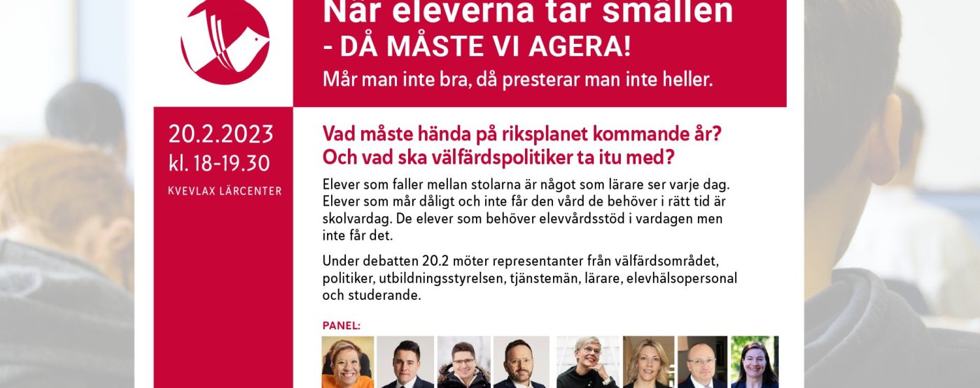 Under debatten 20.2 möter representanter från välfärdsområdet, politiker, utbildningsstyrelsen, tjänstemän, lärare, elevhälsopersonal och studerande.