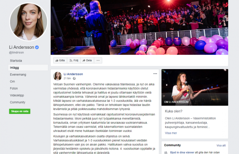 Skärmdump från Li Anderssons Facebooksida den 21 mars.