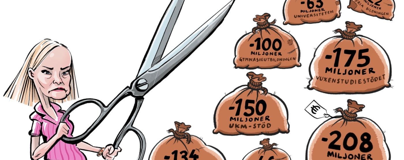 Regeringen har redan gjort utbildningsnedskärningar för omkring 900 miljoner euro. Med budgetmanglingen inför dörren är frågan om nedskärningarna totalt sett kommer att överskrida en miljard euro. Om man ska tro på Riikka Purra är svaret ja. I sitt förslag till statsbudget går nämligen finansministern hårt fram med saxen.