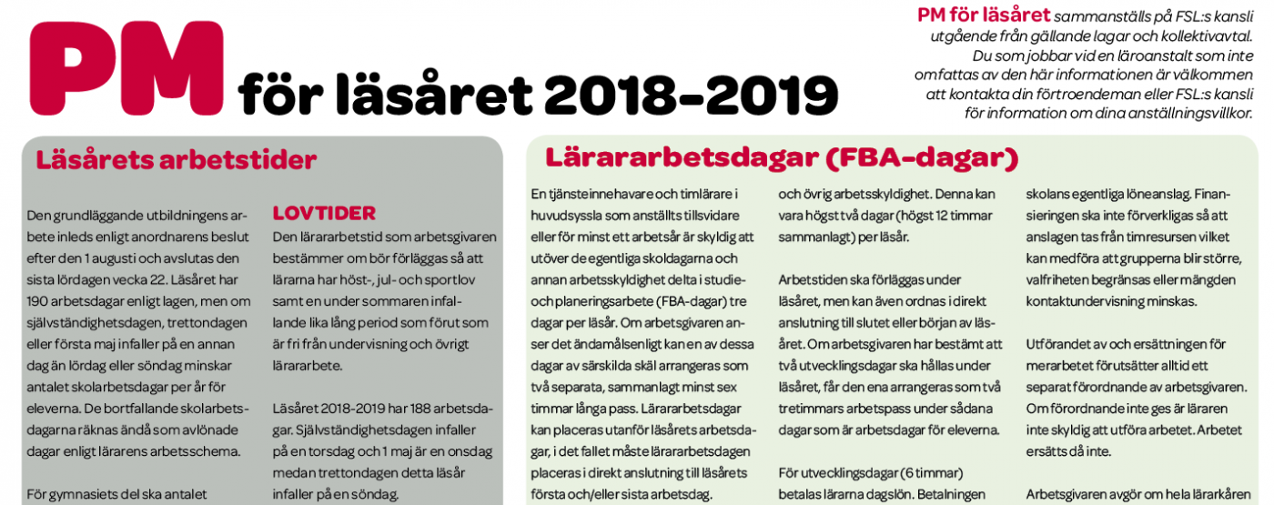 I vårt PM hittar ni bland annat uppdaterad information om nästa läsårs arbetstider, samplaneringen och löner. I detta PM har vi beaktat de nya bestämmelserna i UKTA 2018. Här har vi också publicerat de detaljer som inte rymdes med i den tryckta versionen i tidningen Läraren.