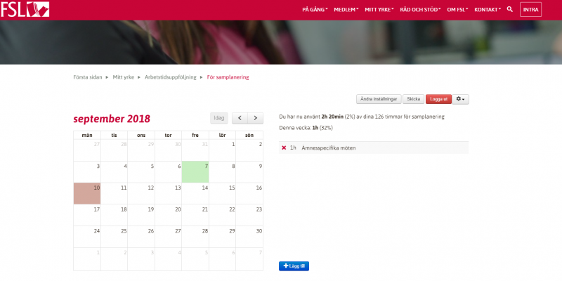 När du är inloggad och fyllt i vissa grunduppgifter kommer du till en kalender där du för varje dag kan fylla i olika typer av arbetsuppgifter och tidsåtgången för dem. För samplaneringstiden till exempel, finns det fyra kategorier: