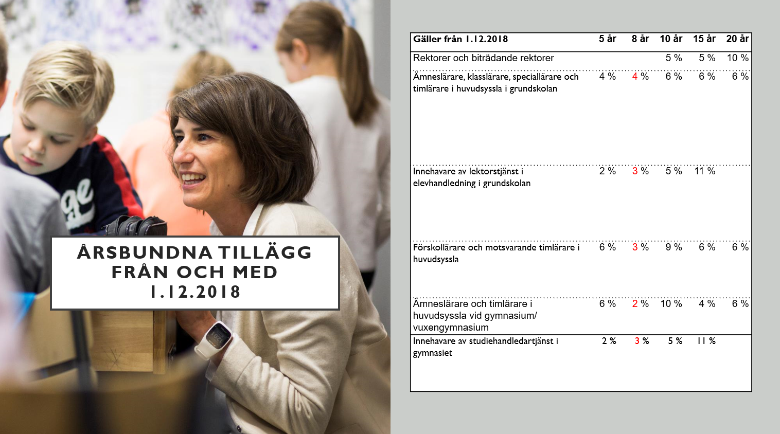 De årsbundna tilläggen justeras från och med 1.12.2018. I praktiken flyttas en procent av det årsbundna tillägget efter åtta till grundlönen. Det här gagnar alltså lärare i början av sin karriär men ingen går miste om några pengar.