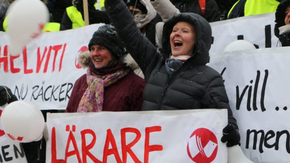 Vädergudarna var inte på lärarnas sida när man samlades till en manifestation på Senatstorget i Helsingfors. Men varken snålblåsten eller det snöblandade regnet hindrade dem från att föra fram sitt budskap. Signalerna är tydliga. Lärarna har fått nog. Det är vår tur nu, säger FSL:s ordförande Inger Damlin. Läs mer i tidningen Läraren.